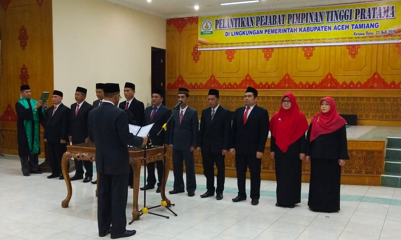Wakil Bupati Aceh Tamiang H T Insyafuddin ST melantik Drs Asra sebagai Inspektur Kabupaten Aceh Tamiang bersama sembilan orang Pejabat Pimpinan Tinggi Pratama lainnya di lingkungan Pemerintah Kabupaten Aceh Tamiang di Aula Setdakab Aceh Tamiang, Selasa (23/07/2019).